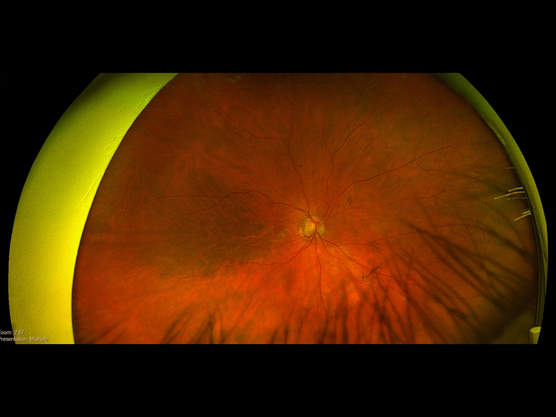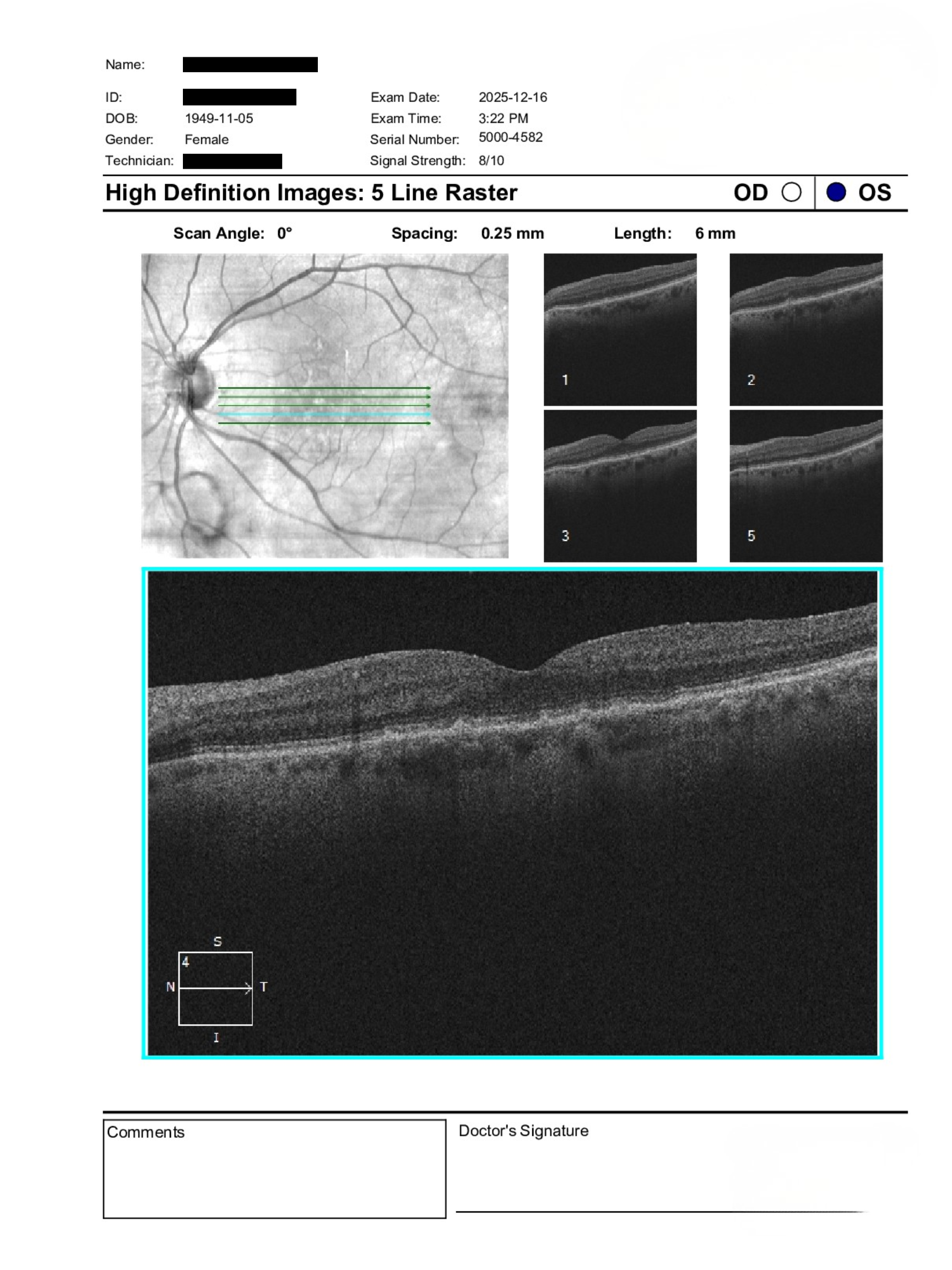 76-year-old female referred for evaluation of a suspected peripheral retinal lesion in the left eye noted on routine exam. BCVA is 20/30 OD and 20/40 OS. IOP measures 19 mmHg OD and 17 mmHg OS. Anterior segment is unremarkable with clear PCIOLs OU. Posterior segment shows stable drusen OU with no macular fluid on OCT. A questionable far peripheral lesion is noted in the left eye at 4–5 o’clock without symptoms of flashes or floaters.